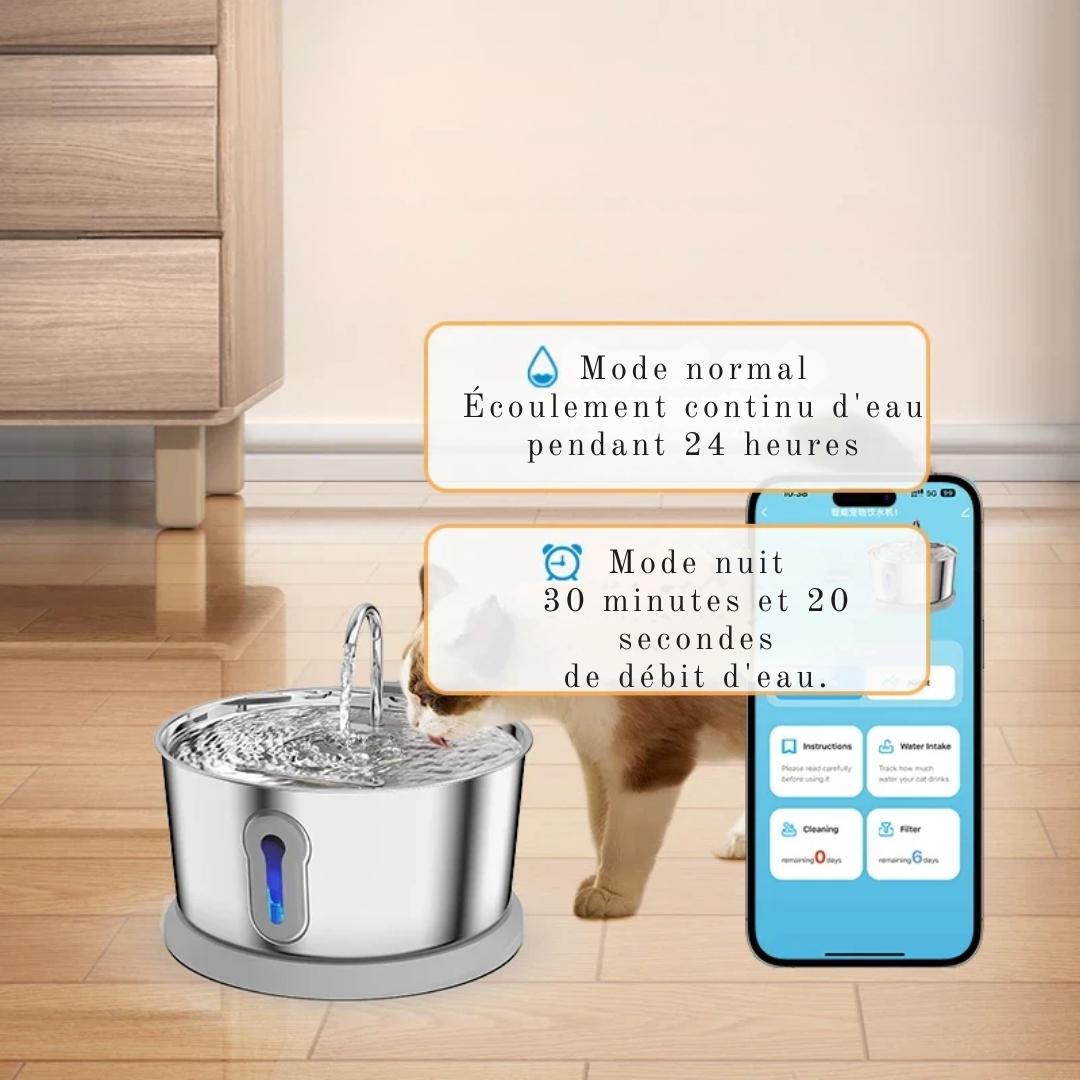 Deux modes sont disponibles : un mode continu, avec un flux d’eau permanent, et un mode périodique intelligent qui n’active la pompe que lorsque le chat boit, réduisant ainsi la consommation électrique jusqu’à 70 %.